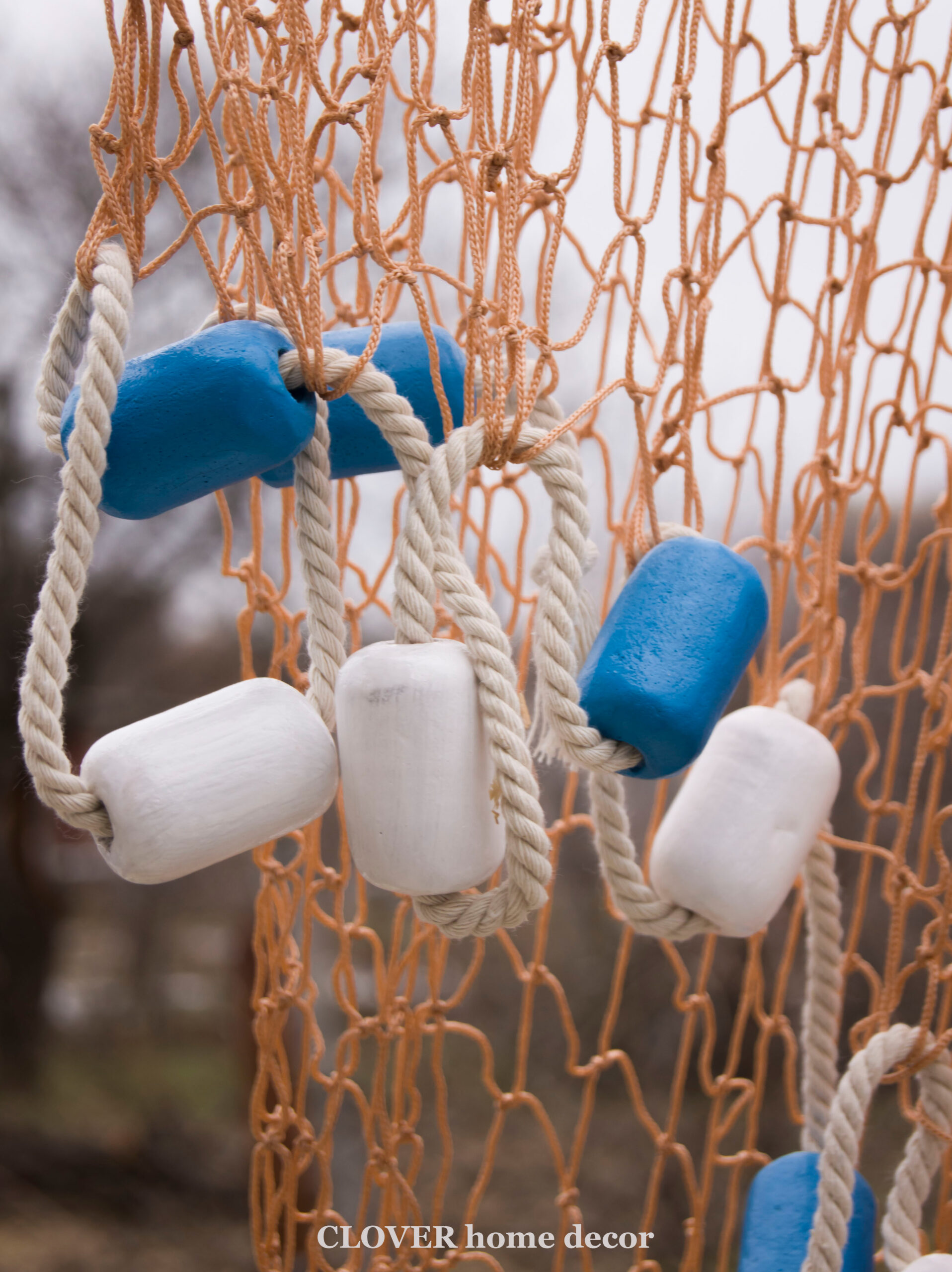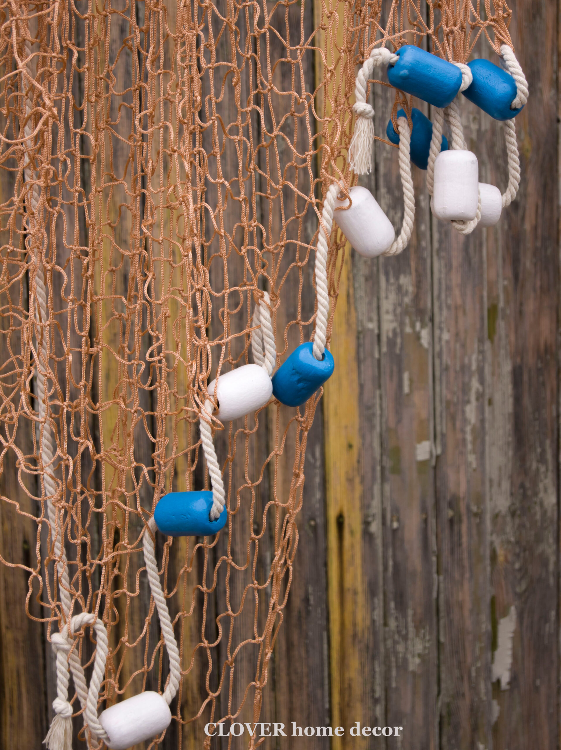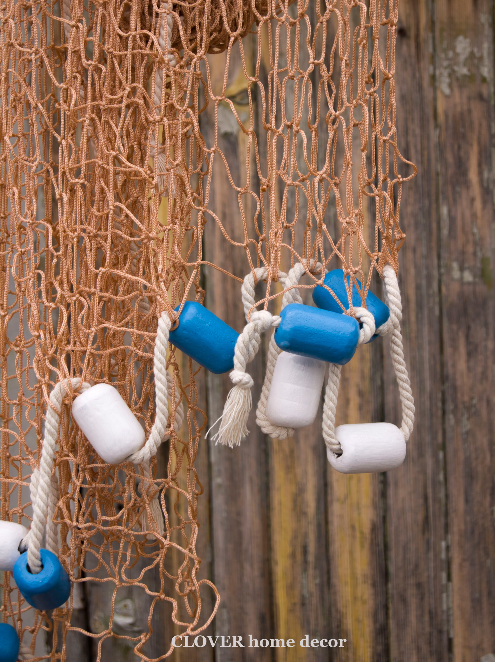 Декоративна рибальська сітка ручної роботи декорована поплавцями і мотузкою.