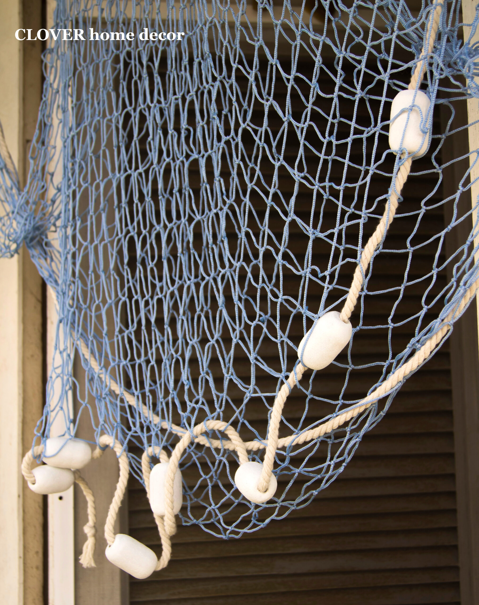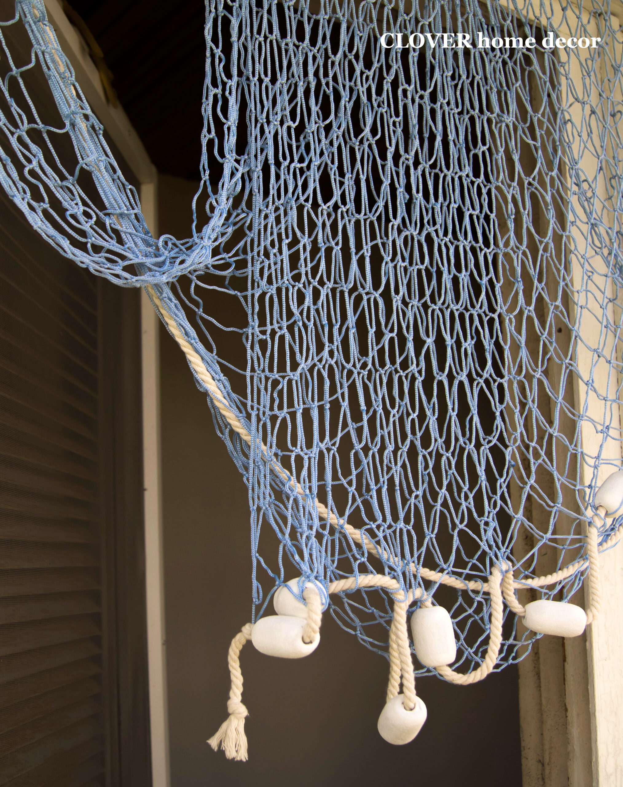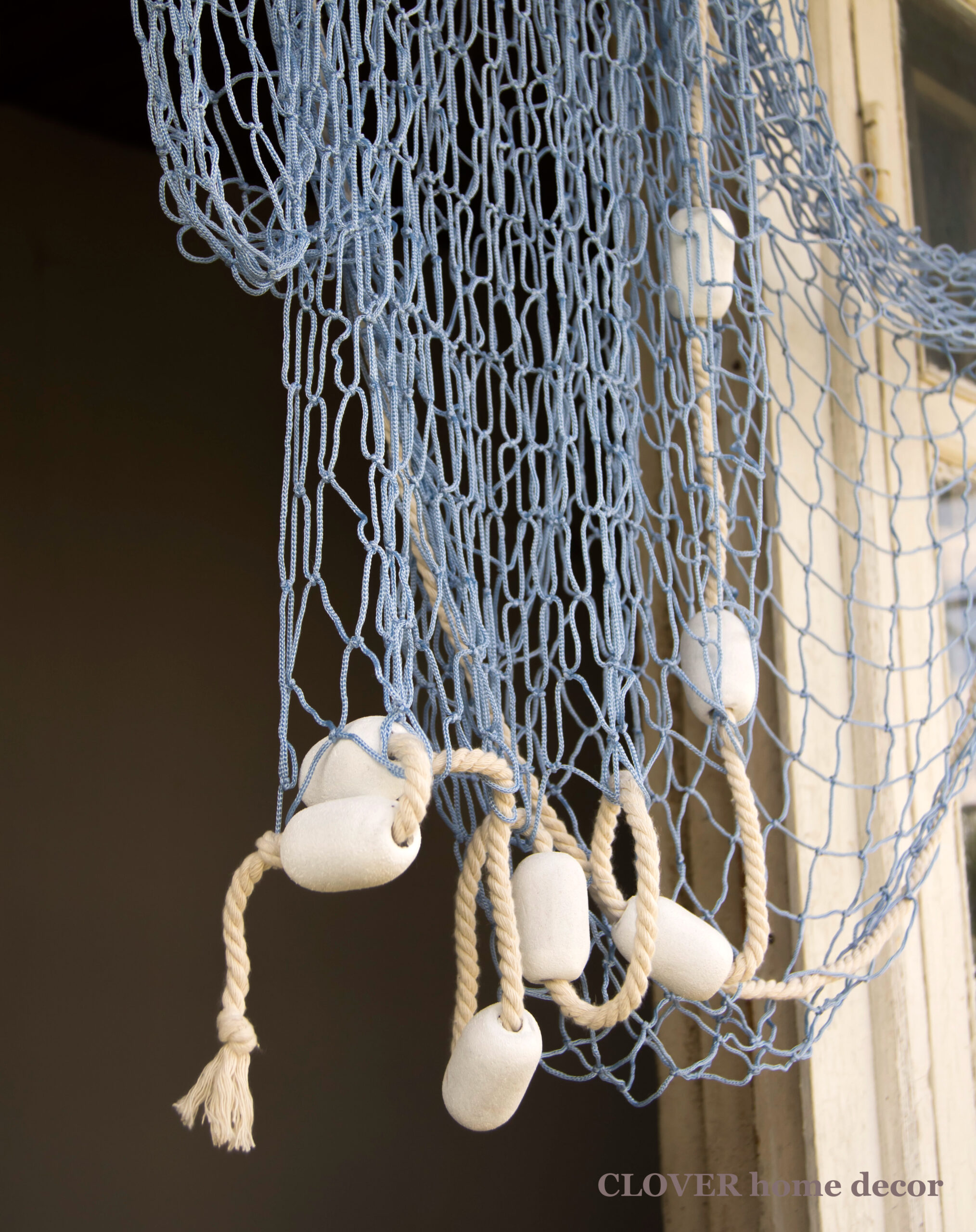 Декоративна рибальська сітка ручної роботи декорована поплавцями і мотузкою.