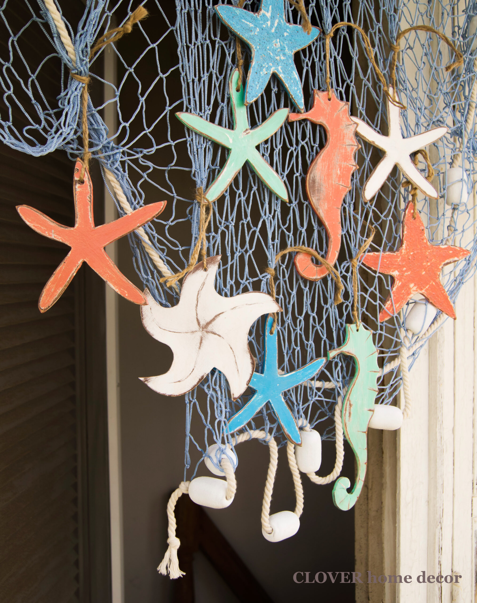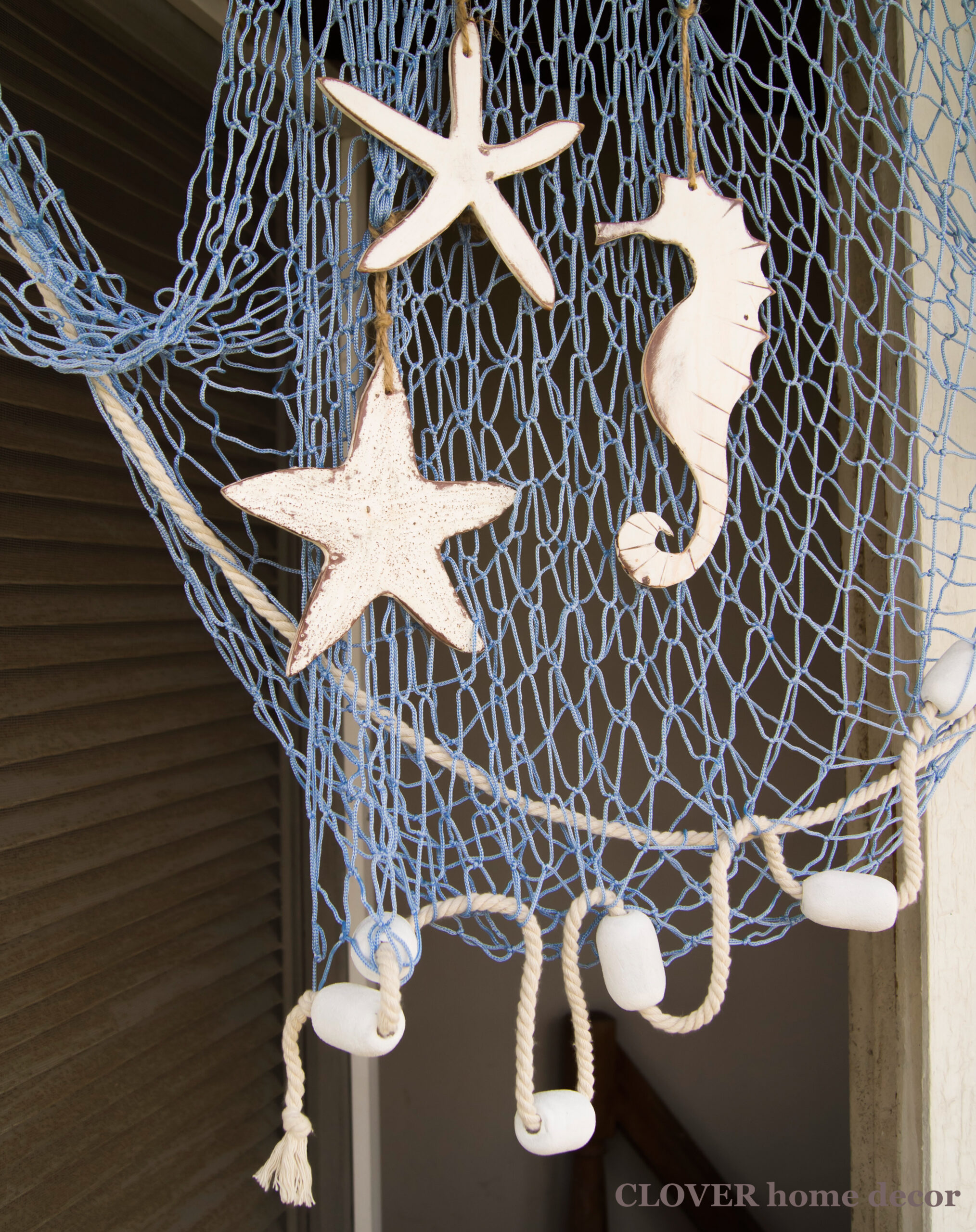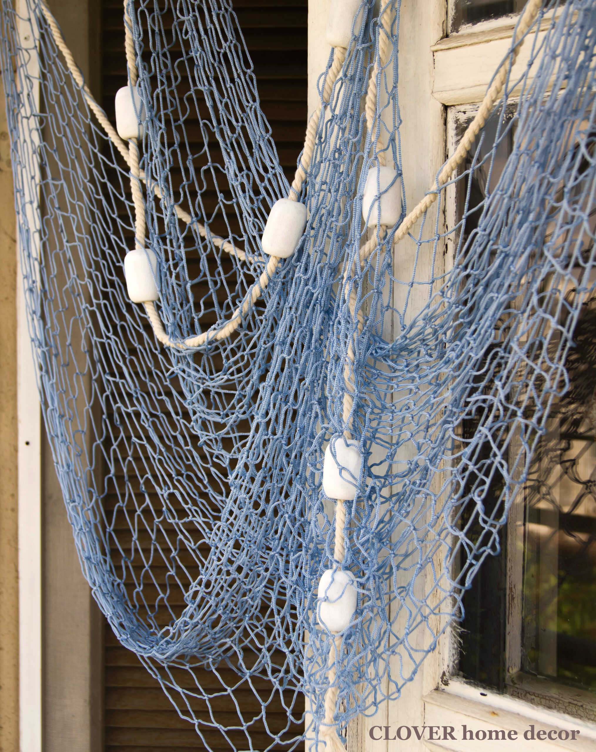 Декоративна рибальська сітка ручної роботи декорована поплавцями і мотузкою.