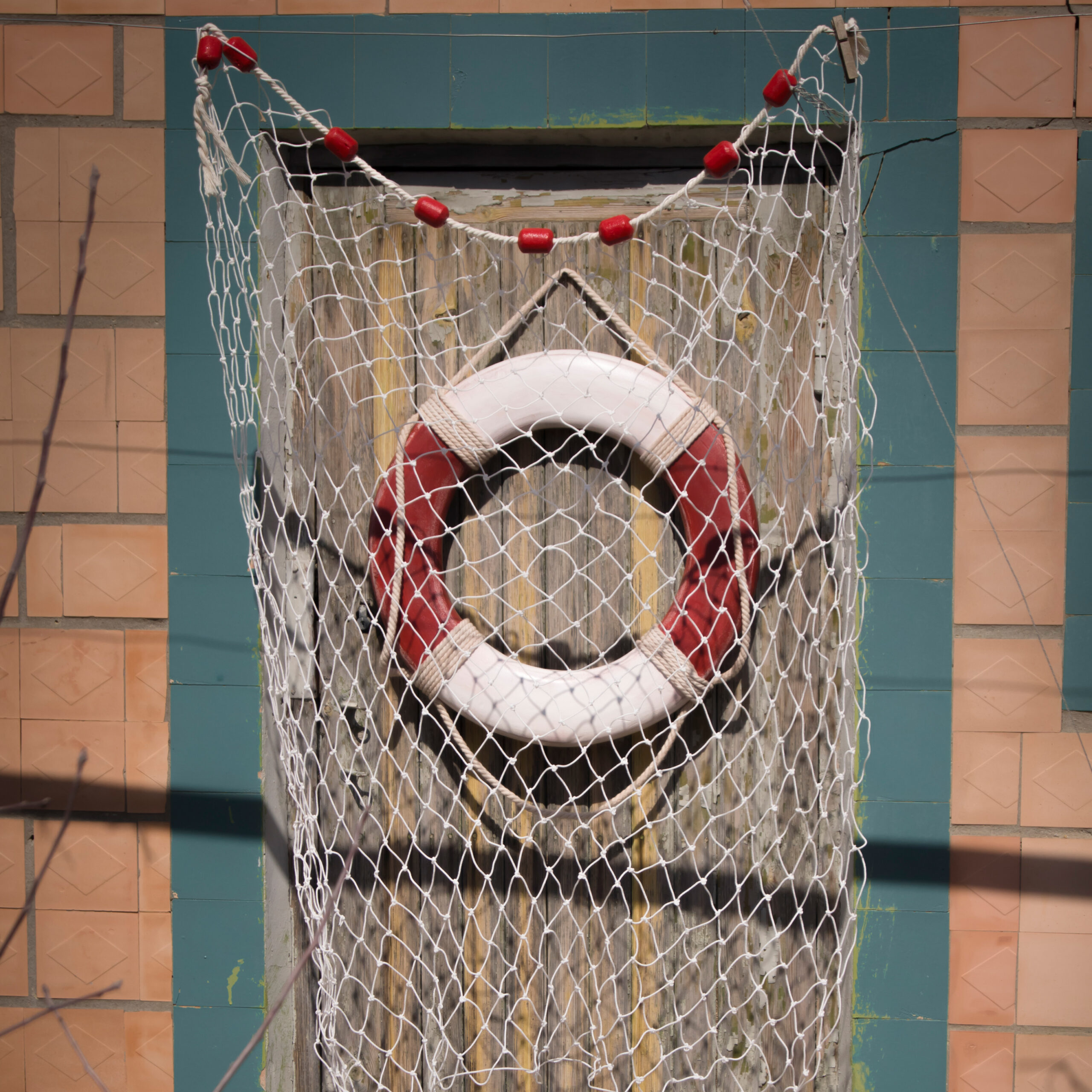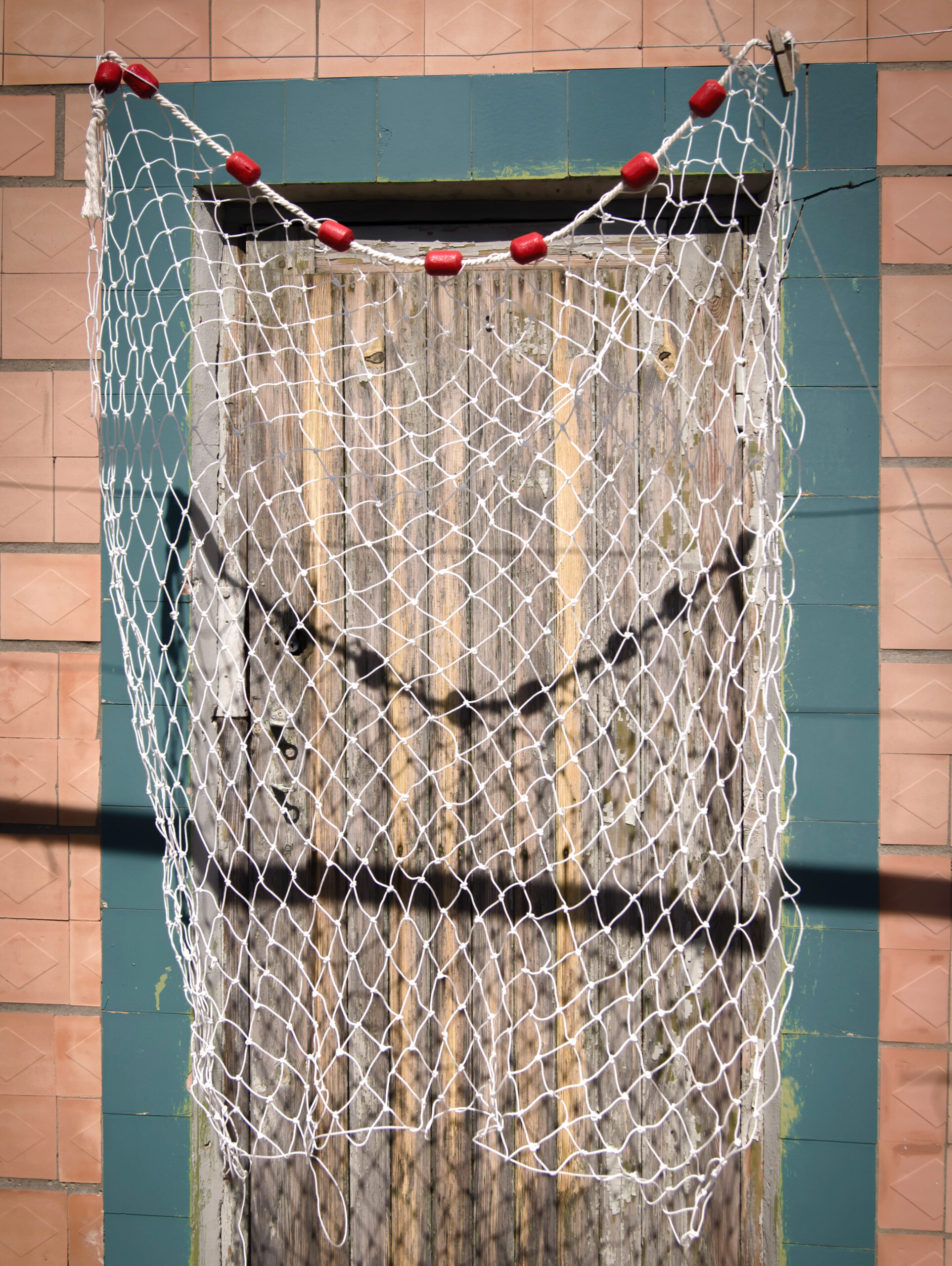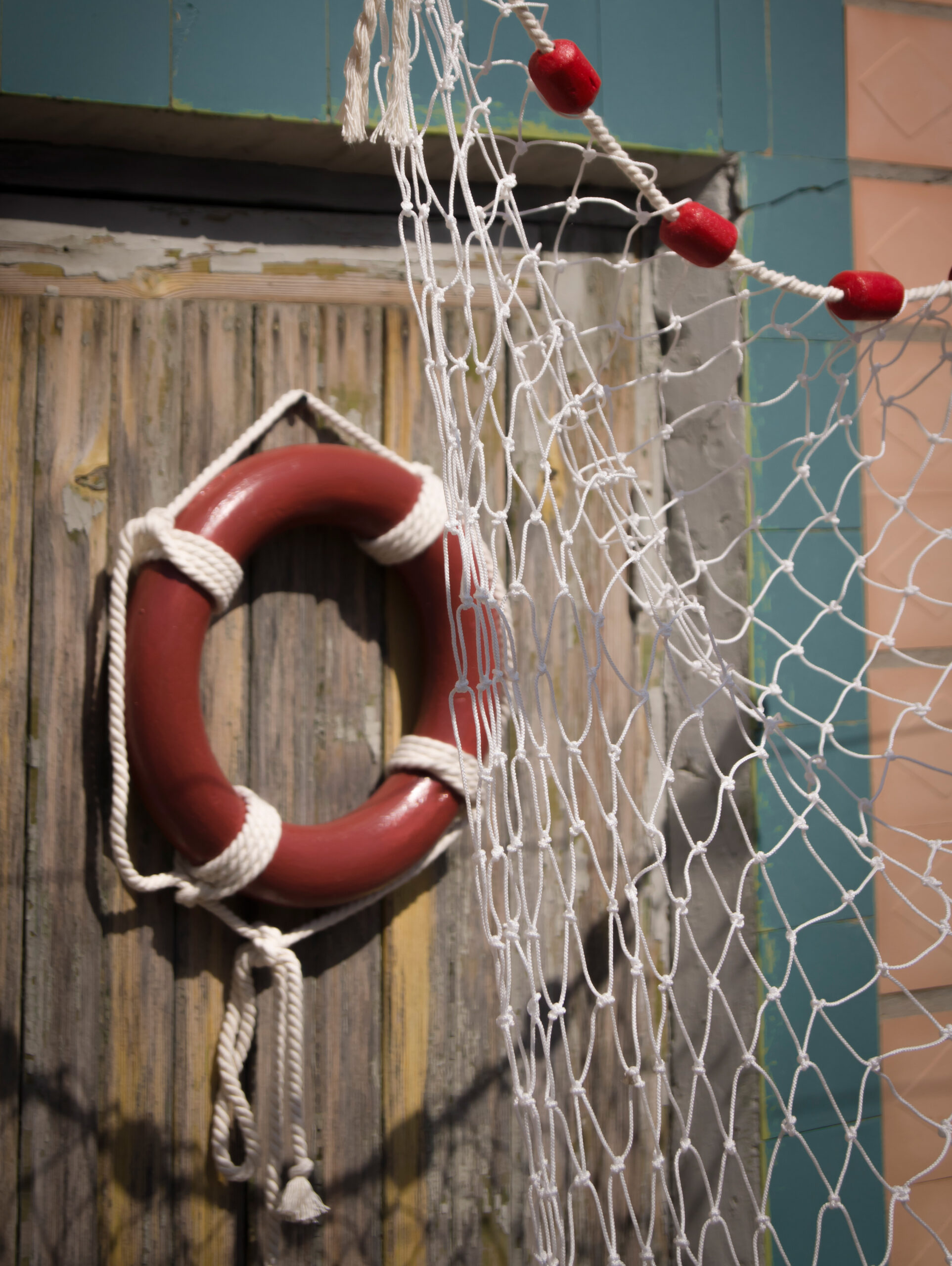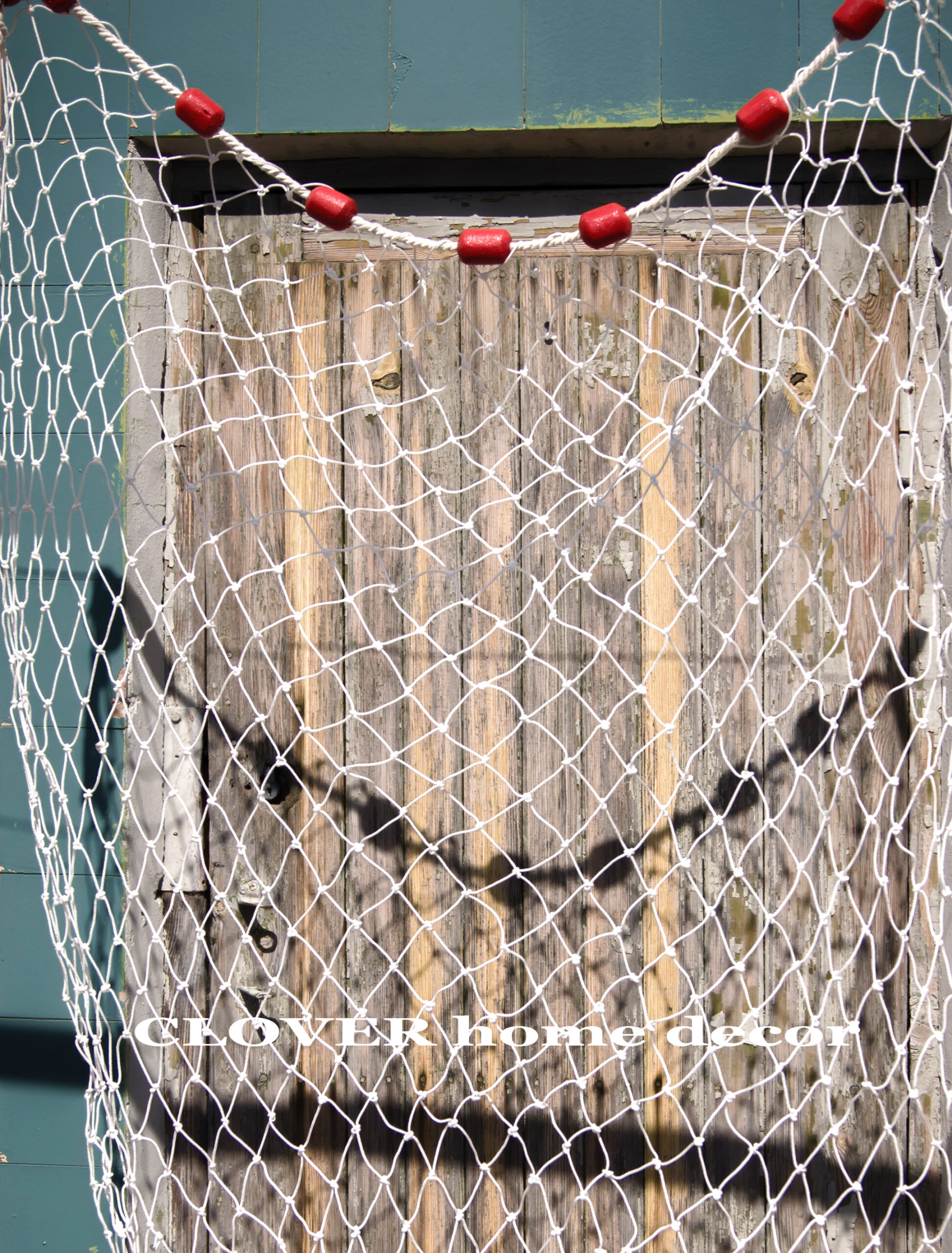Декоративна рибальська сітка ручної роботи декорована поплавцями і мотузкою.