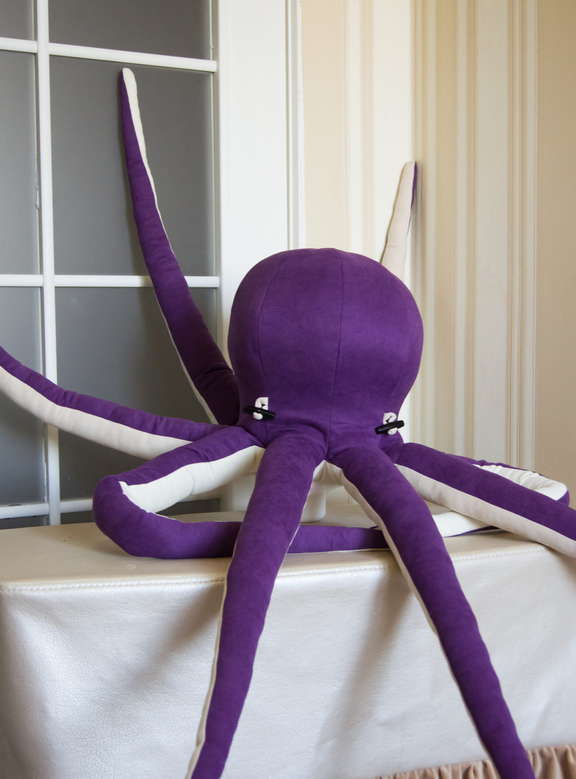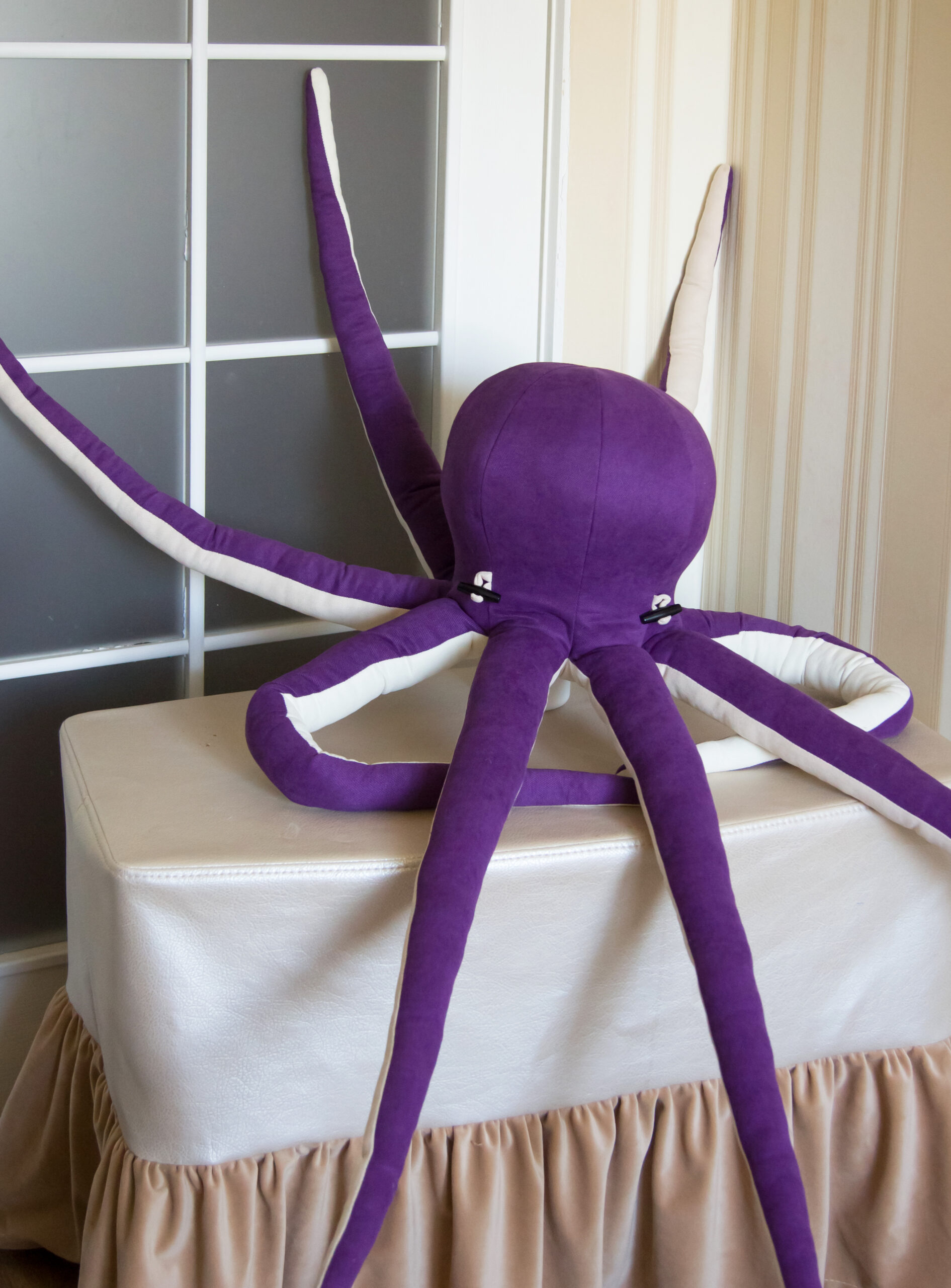 Розкинувши щупальця на дивані, цей морський мешканець нікого не залишить байдужим! Загальна довжина – 90 см а діаметр голови – 30 см. Виготовлений з велюру. Наповнювач – синтепух. Можна «делікатно» прати при температурі 30 градусів.